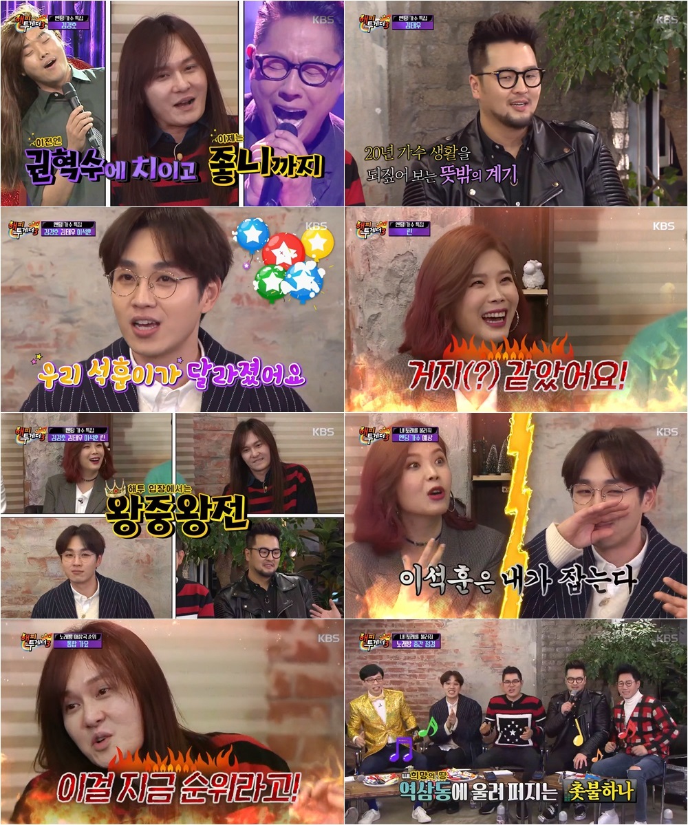 목요일 밤의 터줏대감 KBS 2TV ′해피투게더3′(이하 ‘해투3’)의 25일 방송은 배해선, 이수경, 한보름, 김세정이 출연하는 ‘해투동-여신과 함께 특집 2탄’과 김경호-김태우-이석훈-린이 출연하는 ‘전설의 조동아리-내 노래를 불러줘:엔딩가수 특집 1탄’으로 꾸며졌다. 특히 이날 ‘내 노래를 불러줘:엔딩가수 특집’에서는 앞서 ‘내 노래를 불러줘’에 출연해 ‘엔딩가수’라는 불명예를 안은 가수들이 설욕전을 펼치기 위해 재방문해 이목을 집중시켰다.
