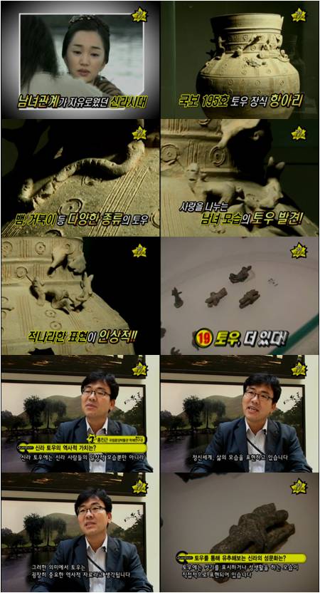 항아리 장식의 토우 뿐만 아니라 솔직하고 과감한 표현의 신라시대 19금 토우들을 손쉽게 찾을 수 있었는데, 이러한 토우들에 관해 국립중앙박물관의 학예연구원은 "신라 토우에는 신라사람들의 일상적인 모습 외에도 그들의 정신세계, 삶의 모습을 표현하고 있다. 그러한 이유에서 토우는 굉장히 중요한 역사적 자료라고 생각된다."며 "토우에는 성기를 표시하거나 성생활을 하는 모습이 직접적으로 표현 되어 있다. 이러한 것으로 볼때 신라의 성문화가 상당히 자유로웠다는 것으로 추측할 수 있다."고 설명했다.