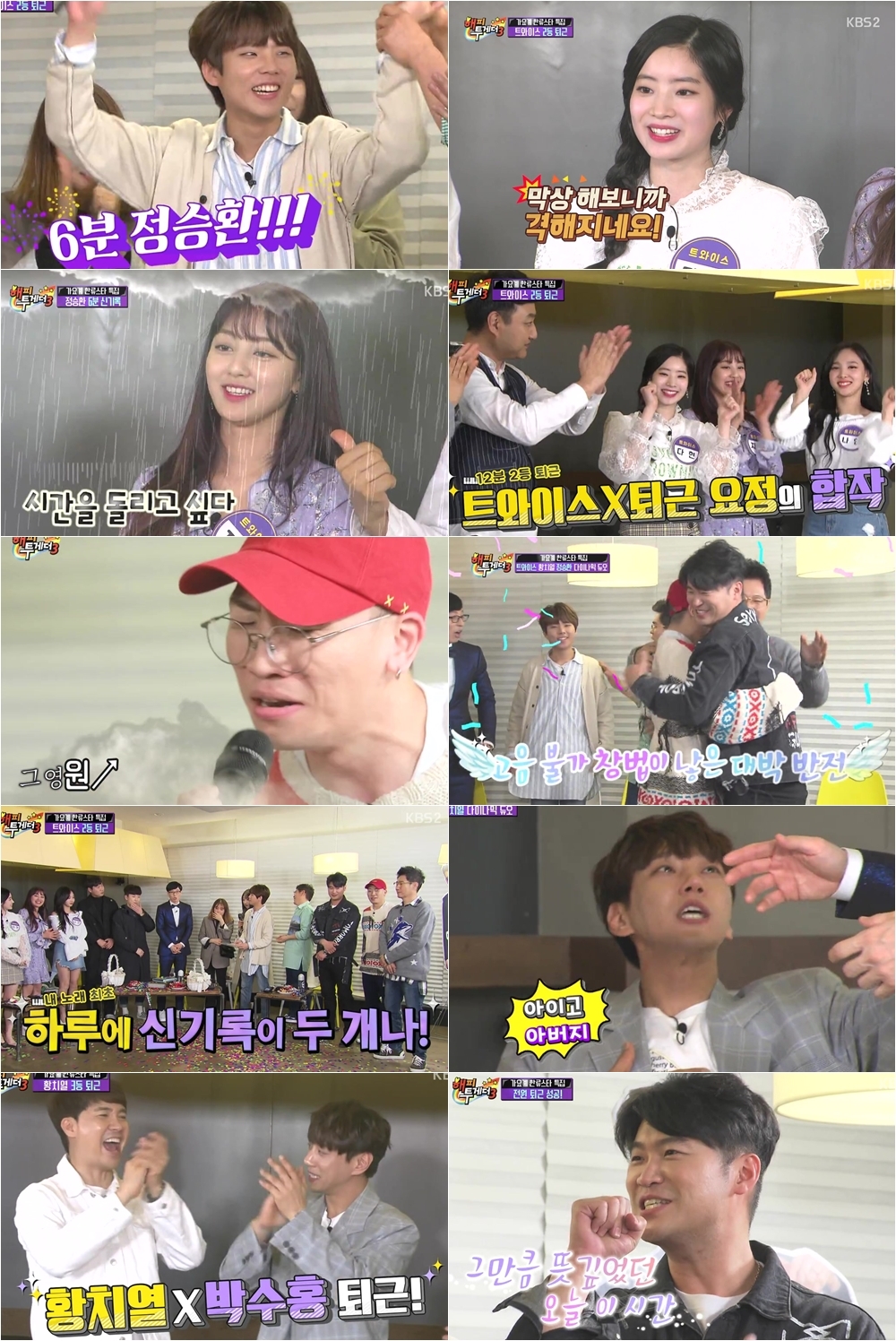 KBS 2TV ′해피투게더3′(이하 ‘해투3’)의 3일 방송은 빙상 여제 이상화-심석희-최민정-민유라가 출연한 가정의 달 특집 ‘쟁반노래방 리턴즈:국가대표 노래방 1탄’과 다이나믹듀오-황치열-정승환-트와이스가 출연한 ‘전설의 조동아리:내 노래를 불러줘-가요계 한류스타 특집 2탄’으로 꾸며졌다. 이 가운데 지난주에 이어 본격적인 퇴근 대결을 펼친 ‘내 노래를 불러줘’에서는 왕중왕전 못지않은 진기록이 탄생하는 등 돌발 상황과 반전이 속출하며 시청자들에게 리얼한 재미를 선사했다.