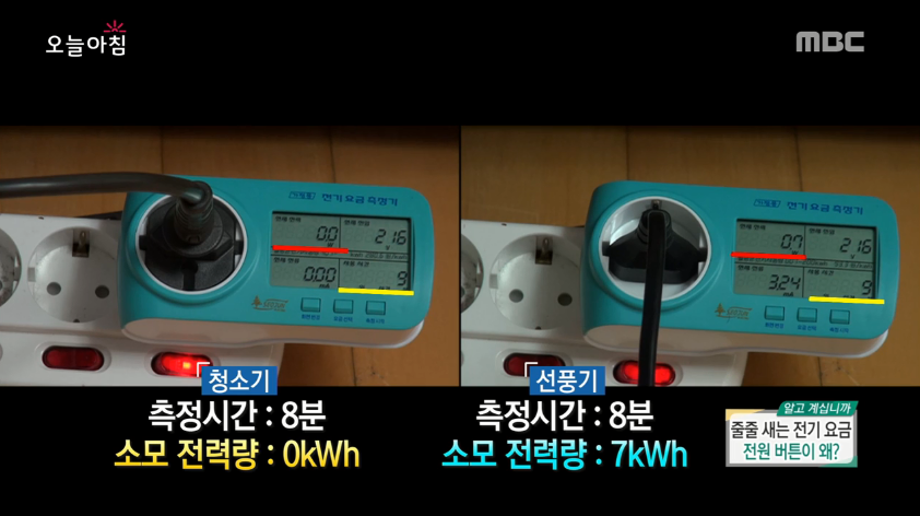 실험삼아 제작진은 대기전력을 소비한다는 전원버튼이 달린 선풍기와, 대기전력을 소비하지 않는다는 전원버튼의 청소기를 똑 같은 8분 동안 가동시켜봤다. 그 결과, 선풍기는 7kW의 전력을 썼지만 청소기는 전력 소모량이 전혀 없어, ‘버튼 구별법’은 사실로 드러났다.