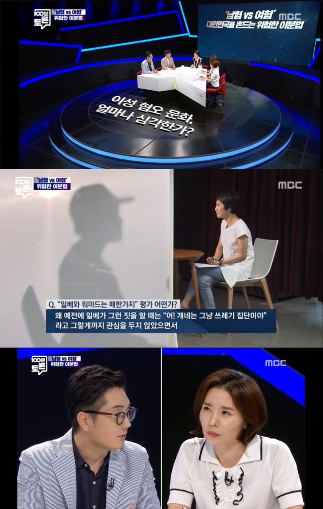 24일(화) 밤 12시 5분에 방송된 MBC ‘100분 토론’에서는 한국사회의 이성 간 혐오 문제를 두고 윤김지영 교수(건국대 몸문화연구소)와 이은의 변호사, 이택광 교수(경희대 글로벌커뮤니케이션학부), 그리고 정영진 시사평론가가 논객으로 나와 치열한 토론을 펼쳤다.