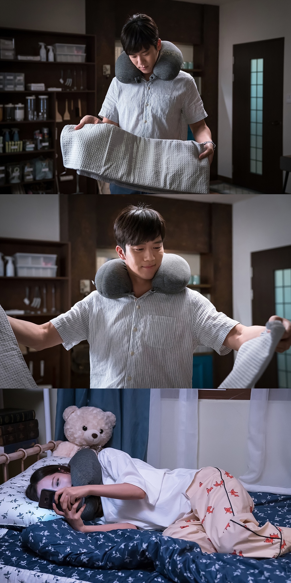 공개된 스틸컷 속 목 베개를 두르고 담요를 펼쳐보고 있는 지운. 그의 따뜻한 미소만큼이나 시선을 사로잡는 것이 바로 목 베개에 새겨진 메시지다. 삐뚤빼뚤 서툴지만 정성스러움이 느껴지는 자수로 ‘우리 김쌤 꺼’라고 적혀있는 것. 침대에 누워 누군가와 연락을 주고받는 다영의 목에도 똑같은 목 베개가 둘려 있어 지운에게 선물한 사람이 누구인지 짐작케 한다. 매일 악몽에 시달렸다는 지운을 걱정하는 따스한 마음이 목 베개를 통해 지운에게 고스란히 전해진 듯하다.
