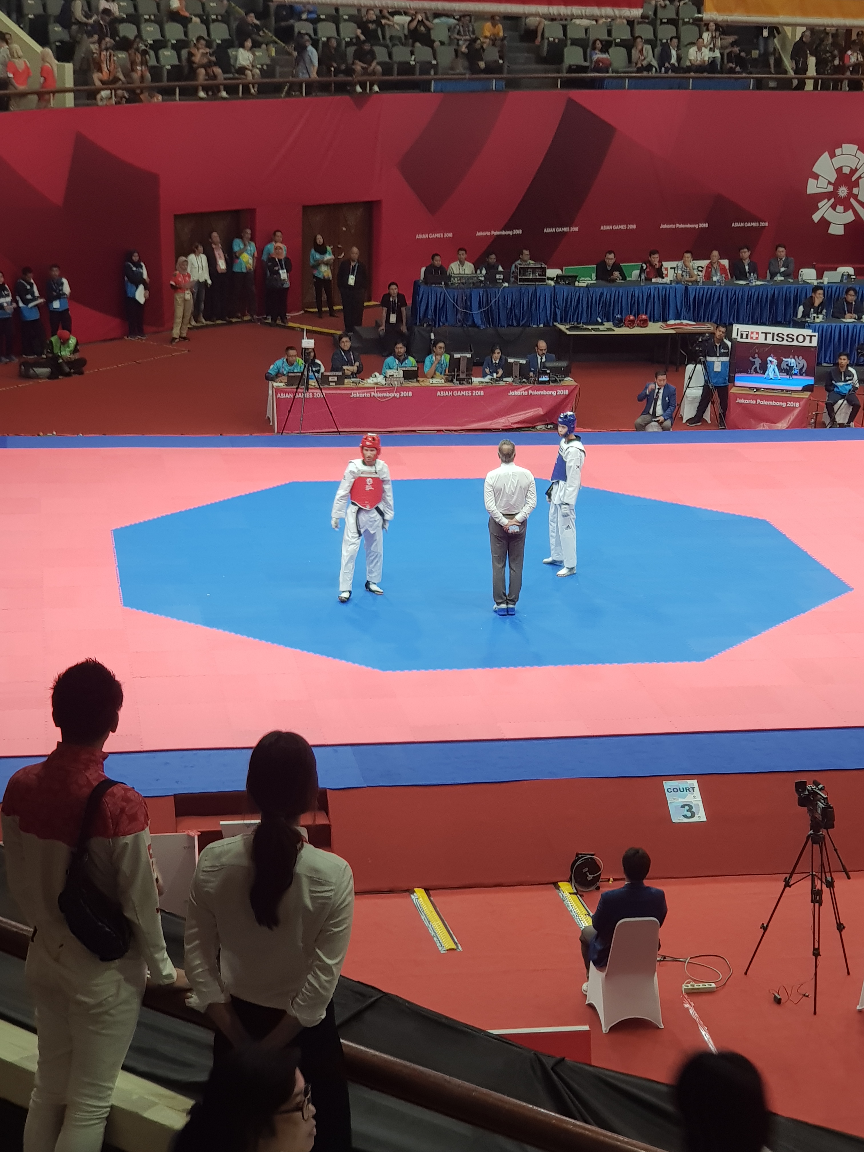 지난 20일, 대한민국의 강력한 금메달 후보 김태훈와 카자흐스탄 옐도스 이스카크 간의 8강전. 중계로 잡혀있지 않은 이 경기에서 오혜리 위원은 당연히 이길 것으로 예상하며 중계석에서 허일후 캐스터와 느긋하게 지켜보고 있었다.