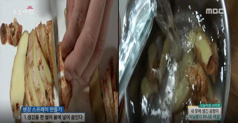 바로 세탁하지 못할 경우, 위의 베이킹소다와 주방 세제를 섞은 것을 옷에 묻혀주면 곰팡이가 착색되는 것을 막아준다. 한편, 생강으로는 세균을 없애고 곰팡이를 막는 데 특효인 천연 항균 스프레이를 만들 수 있다. 행주의 세균을 실제로 측정해 보니, 생강 스프레이를 뿌린 행주의 세균이 약 21배 감소한 것으로 나타났다.