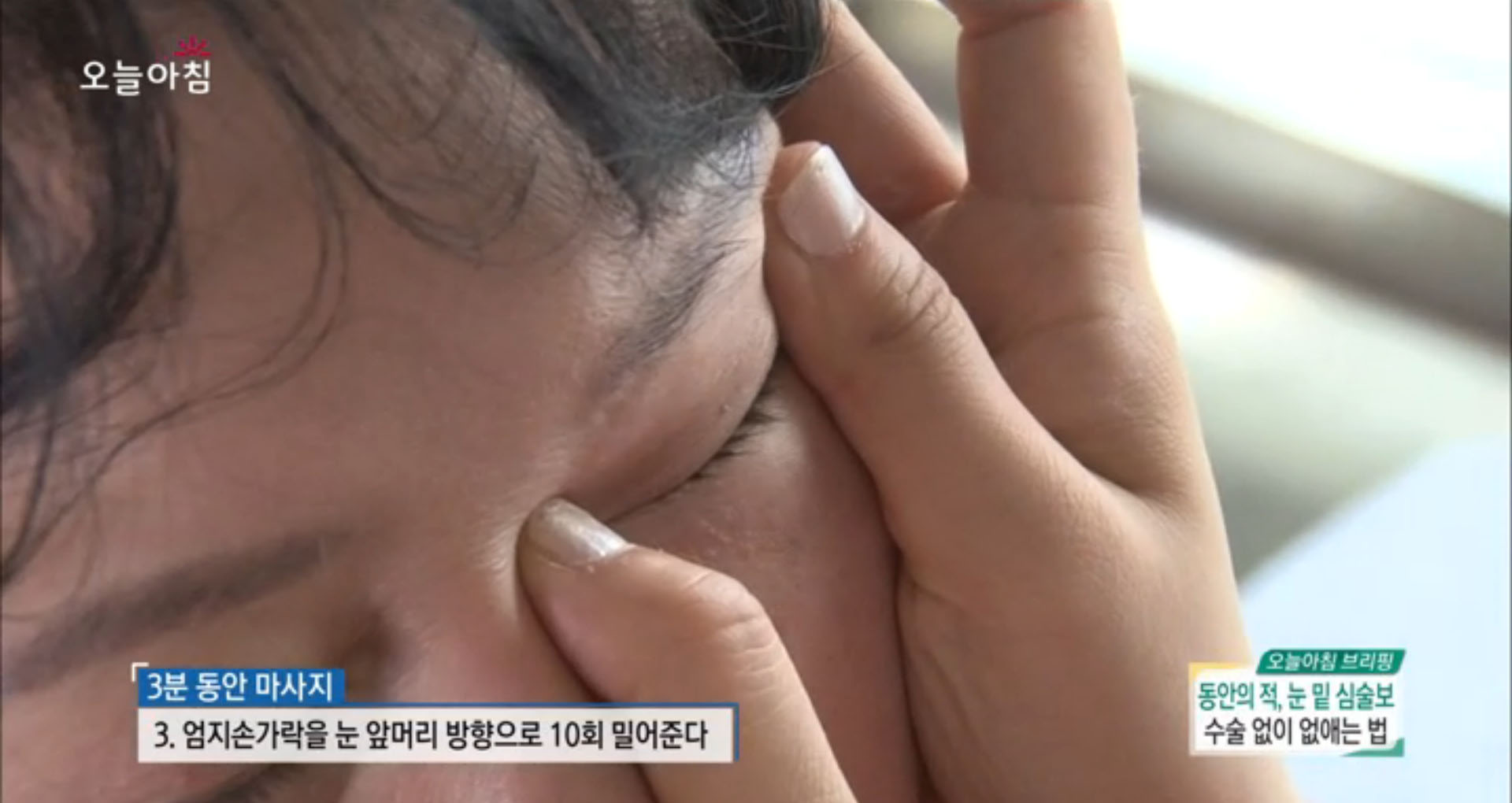 ‘동안의 적’ 눈 밑 지방(심술보)이 고민인 분들을 위해 지난 4일 방송된 ‘생방송 오늘 아침’ 3051회에서는 수술 없이 눈 밑 심술보를 없애는 ‘동안 마사지’ 방법을 공개했다.