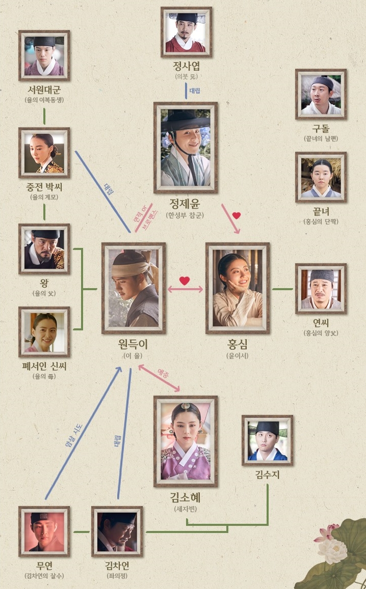 기억을 소실하고 원득으로 전락하면서 홍심과 원치 않는 혼인을 올리게 되는 왕세자 율. 이들의 티격태격 혼인 생활이 궁금해지는 가운데, 묘한 사각 관계를 형성하는 정제윤(김선호)과 김소혜(한소희)에게도 이목이 집중된다. 제윤은 우연히 만난 홍심에게 첫눈에 마음을 빼앗기고, 그녀의 낭군 원득과는 자연스레 연적이 되지만 시간이 지나면서 친구가 된다. 홍심을 향해 적극적인 애정 공세를 펼치고, 원득과는 뜻밖의 브로맨스를 펼치는 제윤의 매력이 기대를 모은다. 또한, 세자빈으로서 로맨스를 극대화할 것이라는 시청자들의 예측과 달리, 실은 오히려 율에게 애증을 느끼는 소혜. 그녀의 비밀스러운 활약도 눈여겨볼 포인트다.