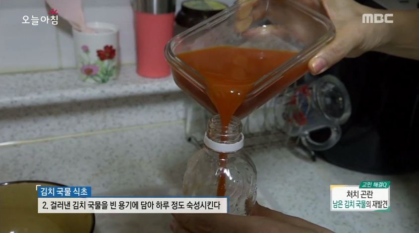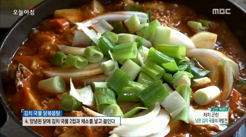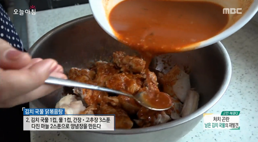 지난달 16일 방송된 ‘생방송 오늘아침’에는 김향심 주부가 등장해 남은 국물을 이용한 요리법을 총정리했다. 첫 번째는 김치 국물을 이용한 닭볶음탕과 묵밥이다. 일반적인 닭볶음탕과 비슷하지만 김치 국물을 넣어주면 잡내를 없애고 더 깔끔한 맛이 난다고.