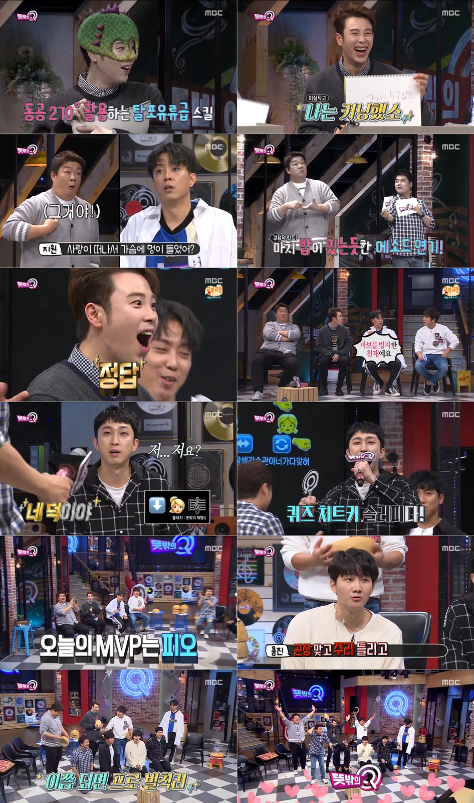 피오의 진가는 ‘이모티콘 퀴즈’에서 빛났다. 그는 앞서 정답을 봐도 모르겠다고 했던 것과 달리 두 번째 문제 만에 정답을 외쳐 시선을 집중시켰다. 피오가 이에 전현무는 “몰랐다는 거 거짓말 아니야?”라고 말하는가 하면 은지원은 “바보를 빙자한 천재에요!”라고 하는 등 피오의 반전 활약에 모두가 깜짝 놀란 모습을 보였다. 그 결과 피오는 모두의 인정을 받으며 당당하게 MVP에 등극하는 쾌거를 이뤘다.
