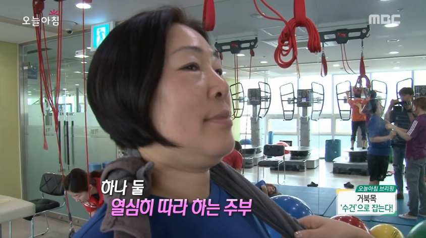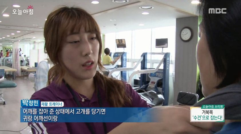 이 동작에 대해 박정민 트레이너는 “어깨를 잡아준 상태에서 고개를 당기면 귀와 어깨선을 자극해 거북목을 잡아준다”고 설명했다. 또 다른 수건 스트레칭으로는 양 손에 수건을 팽팽하게 잡은 뒤 이마에 수건 가운데를 대고, 이마와 손이 미는 힘을 비슷하게 해서 눌러주는 방법도 소개됐다.