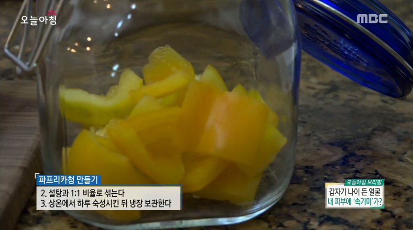 감자 팩은 껍질을 벗긴 감자를 강판에 갈아 밀가루와 1대1 비율로 섞고 얼굴에 올려주면 되며, 파프리카청은 깨끗이 씻은 파프리카를 잘라 유리병에 설탕과 1대1 비율로 섞어둔 뒤 상온에서 하루 숙성시키고 냉장 보관하며 먹으면 된다.