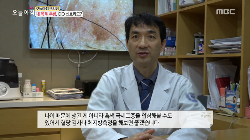 유종호 가정의학과 전문의는 “건조가 심하고 각질화된 목 뒤 주름은 때 수건 등으로 문지르면 더 악화되며, 보습제를 충분히 바르고 병원을 찾아 혈당 조절과 체중감량, 식습관 개선을 해야 한다”고 조언했다.