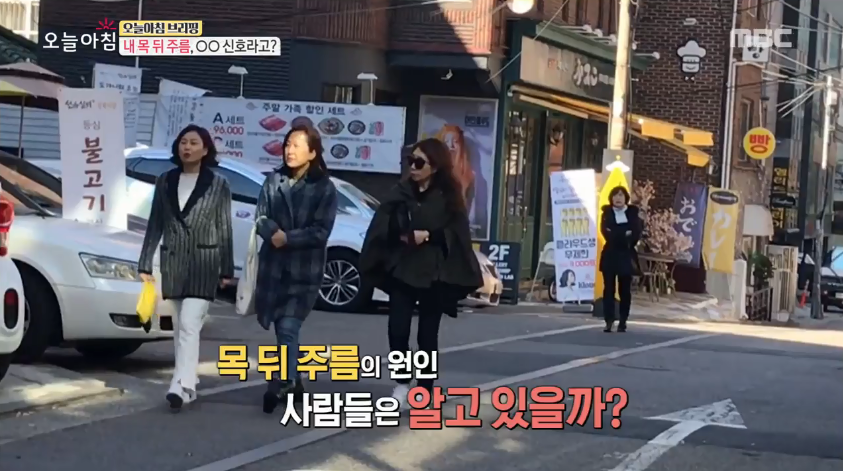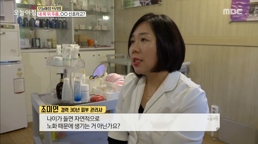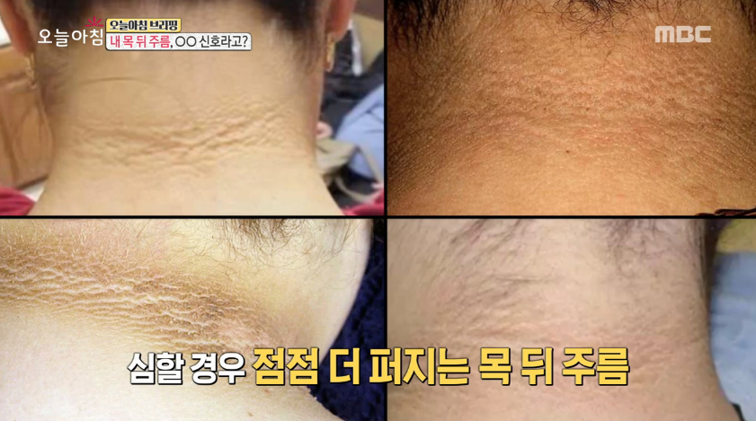 10월 31일 방송된 MBC ‘생방송 오늘아침’에서는 목 뒤에 있는 주름 고민을 파헤쳤다. 시민들에게 질문한 결과 대부분 목 뒤 주름에 대해 “때가 낀 것 아니냐”, “건선인 경우는 봤다”고 말했다. 특히 눈길을 끈 것은 30년 경력의 피부관리사조차 “나이가 들면 노화에 따라 자연스럽게 생기는 것 아니냐”고 말한 부분이다.
