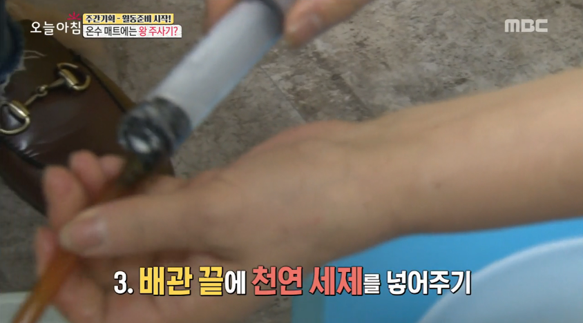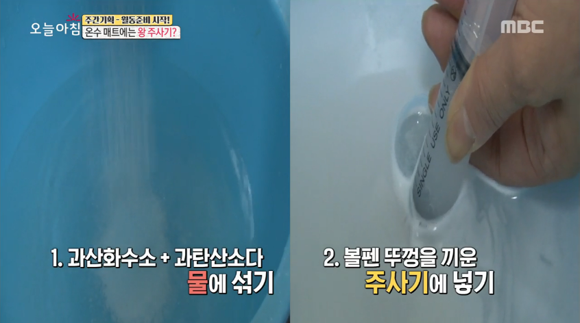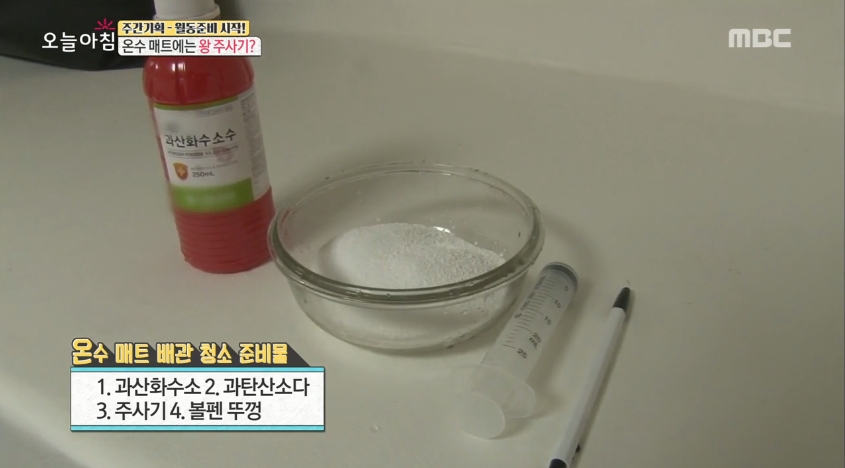 7일 방송된 MBC ‘생방송 오늘아침’에서는 작동을 시켜도 따뜻하지 않은 온수매트를 속 시원하게 배관 청소하는 법을 다뤘다. 준비물은 과산화수소, 과탄산소다, 주사기, 볼펜 뚜껑이며 방법은 다음과 같다.