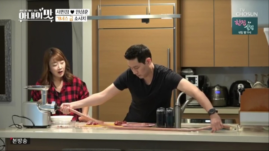 서민정-안상훈 부부는 소시지를 만들며 찰떡궁합 ‘허당 부부’의 면모를 발산했다. 한껏 상기된 표정으로 신발장에 숨겨뒀던 택배 상자를 꺼내 들고 나온 안상훈이 서민정 앞에 야심차게 고기를 다지는 기계를 소개한 상황. 안상훈은 또 다른 주방 기계의 등장에 한숨을 내쉬는 서민정의 반응에도 아랑곳하지 않고, 뚝딱 기계를 조립해냈지만 정작 사용법을 몰라 헤매는 모습을 보였다.