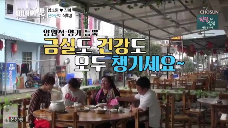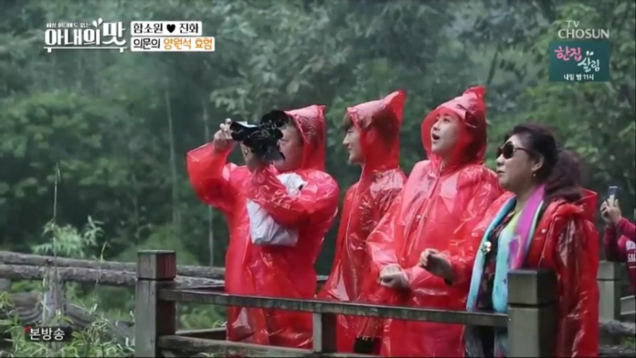이후 ‘함진 패밀리’는 중국 어머니의 주도하에 중국 광동지역 4대 명산인 단하산을 방문했다. 산모가 산의 정기를 받아 출산 때 복을 가져다준다는 속설에 시어머니가 며느리 함소원을 위해 준비한 여행인 것. 가족들은 중국 아버지의 하모니카 연주와 함께 유람선을 타고 비경을 즐겼고, 근처 식당에서 다양한 음식들과 광동지역 지역 술로 여행을 마무리했다. 특히 분위기에 취한 시아버지가 시조를 지어 보이자, 시어머니 역시 “아, 경치가 수려하니 밥 다섯 공기 그냥 들어가네”라는 대식가다운 센스 있는 시조로 응수, 현장을 웃음바다로 만들었다.