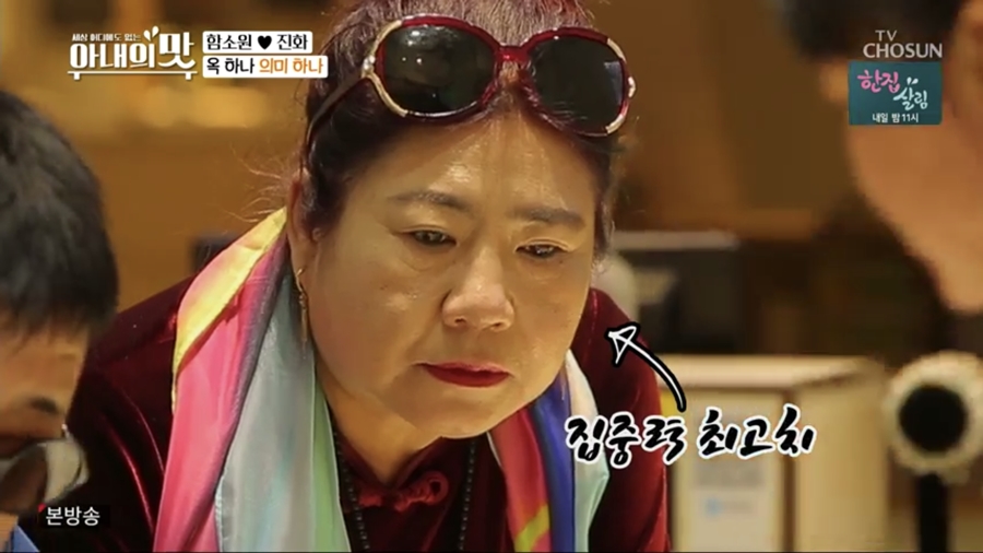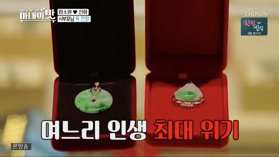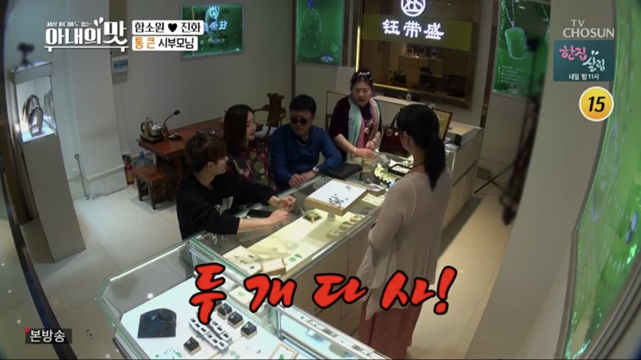 함소원-진화 부부는 시부모님과 함께 뱃속 아기 ‘엄살이’를 위한 보석을 구매하기 위해 ‘광저우 보석 거리’를 방문했다. 온갖 금과 옥이 번쩍이는 와중, ‘함진 부부’를 곤혹스럽게 했던 것은 금을 사랑하는 시어머니와 옥을 사랑하는 시아버지의 때 아닌 ‘옥금 전쟁’이었다. 아기에게 걸어줄 보석을 고르는 때, 시아버지는 ‘평안’이라는 의미가 있는 옥을, 시어머니는 금테두리의 옥을 골랐던 것. 두 사람의 의견대립은 생각보다 치열했고 결국 견해를 좁히지 못한 끝에 두 보석 모두 다 구매하게 되는 입 떡 벌어지는 해프닝이 펼쳐졌다.