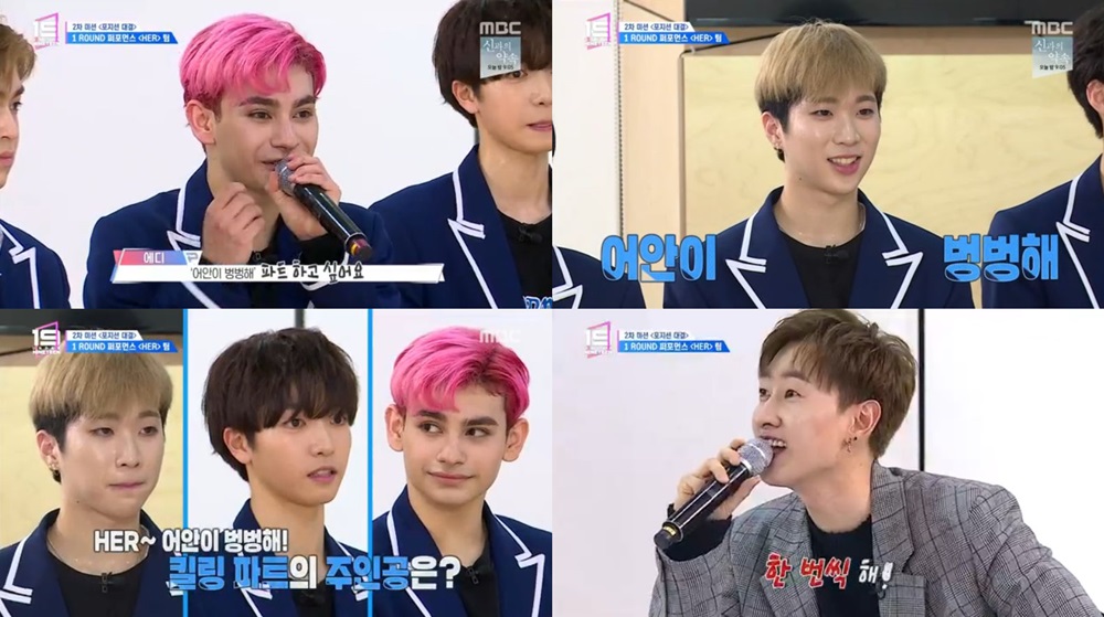 이날 퍼포먼스 파트 박시영과 신찬빈, 에디는 다른 예비돌들과 함께 블락비의 ‘HER’(헐)로 무대를 선보였다. 본 무대에 앞서 세 사람은 파트에 대한 욕심으로 보는 재미를 더했다.