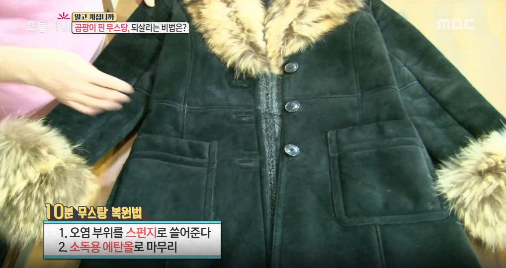 무스탕은 옷장에 잘못 방치하면 곰팡이가 생겨 골칫덩이가 되기 쉽다. 이에 세탁 전문가가 공개한 비법은 바로 ‘스펀지’. 위아래로 살살 쓸어만 주면 무스탕 곰팡이가 말끔히 지워진다는 것. 또한 옷감의 손상을 막고, 광택을 살려주는 효과까지 얻을 수 있다고 한다. 이어 소독용 에탄올을 분무기에 넣어 뿌려주면, 무스탕에 곰팡이가 생기는 것도 막을 수 있다.