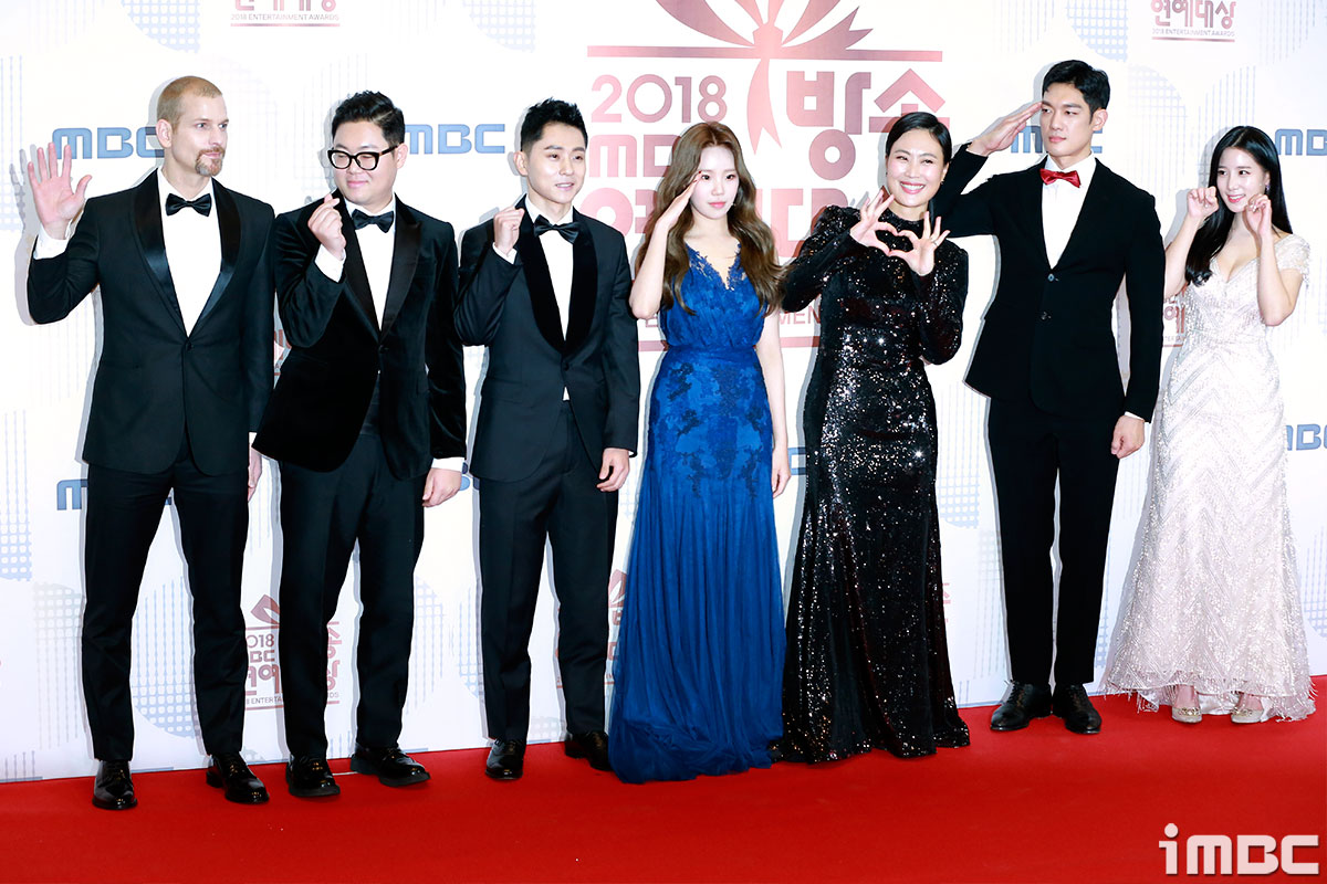'진짜사나이300' 출연진(매튜 다우마,감스트, 김재화, 안현수, 조현, 주이, 박재민)이 29일 오후 서울 마포구 상암동에서 진행된 '2018 MBC 방송연예대상'시상식에 참석해 포토타임을 갖고 있다.
