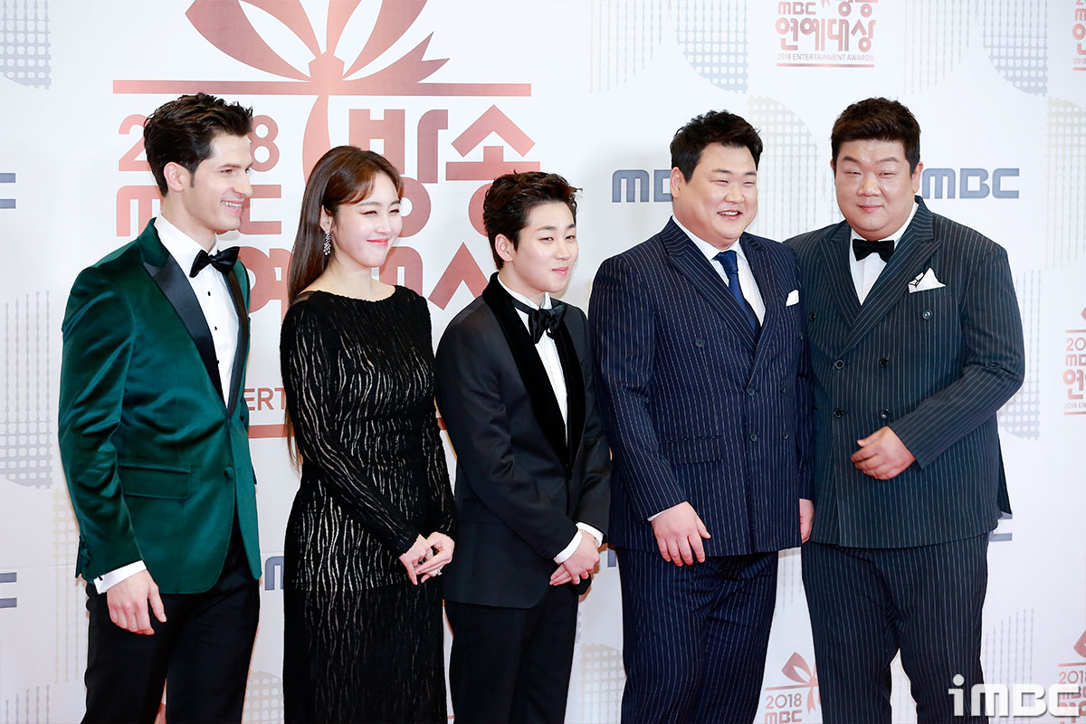 '어서와 한국은 처음이지'와 '공복자들' 출연진(유민상, 김준현, 딘딘, 신아영, 알베르토 몬디)이 29일 오후 서울 마포구 상암동에서 진행된 '2018 MBC 방송연예대상'시상식에 참석해 포토타임을 갖고 있다.