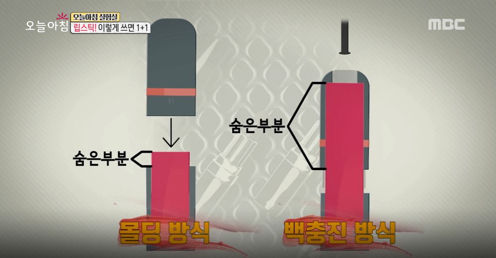 화장품 제조사만 아는 립스틱 내용물 주입 방식이 있다? 미용화장품과학과 하병조 교수는 “립스틱 제조 방식에는 몰딩, 백충진 방식이 있습니다. 몰딩 방식은 몰드(금형)에 립스틱 내용물을 부어서 굳힌 후에 립스틱 용기 전방부에 끼우는 방식을 말합니다”라고 설명했다. 백충진 방식은 립스틱 용기를 거꾸로 세워서 용기 바닥에 내용물을 주입해 굳힌다는 것.