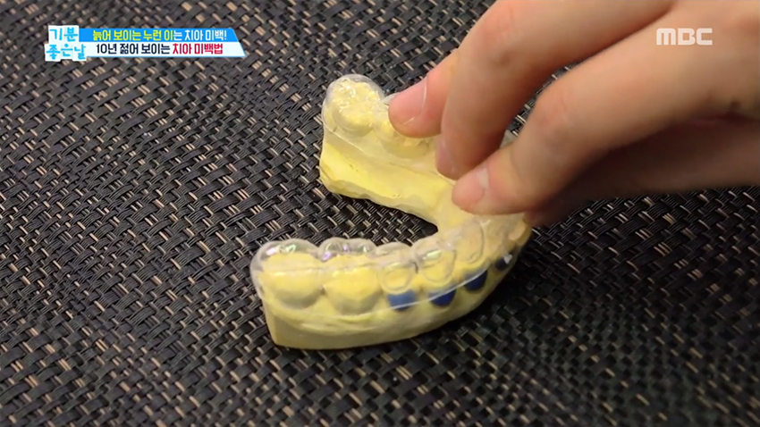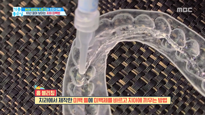 - 치과에서 제작한 미백 틀에 미백제를 바르고 치아에 끼우는 방법.