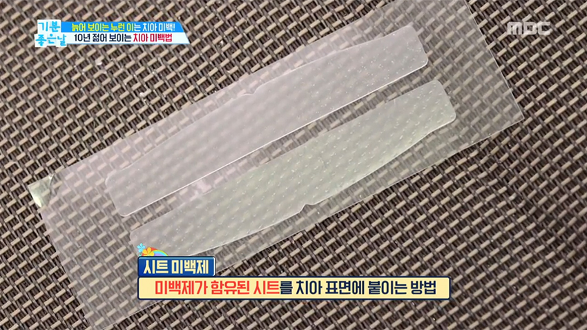 - 미백제가 함유된 시트를 치아 표면에 붙이는 방법.