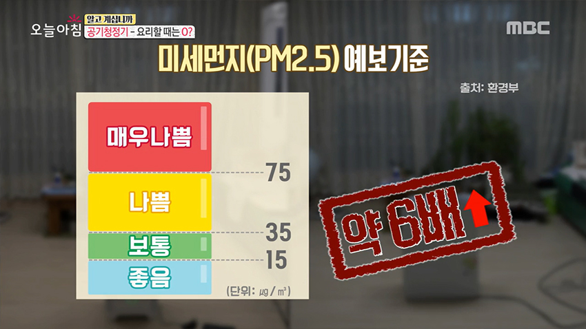 4. 실내에서 요리를 할 때 올바른 공기청정기 사용법은 창문을 열고 환기를 먼저 한 후에 공기청정기를 사용하는 것이 효과적인다. 그 이유는 요리 시 단시간에 높은 농도의 먼지가 배출되기 때문에 바깥의 미세먼지 농도가 높더라도 빨리 환기 후 농도를 낮추는 선행 조건이 필요하다.