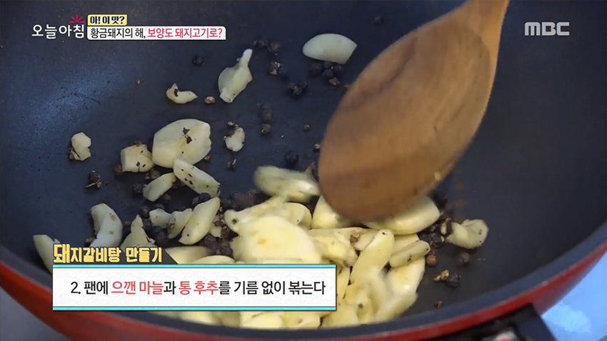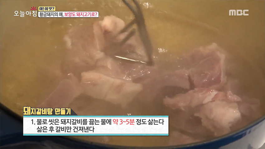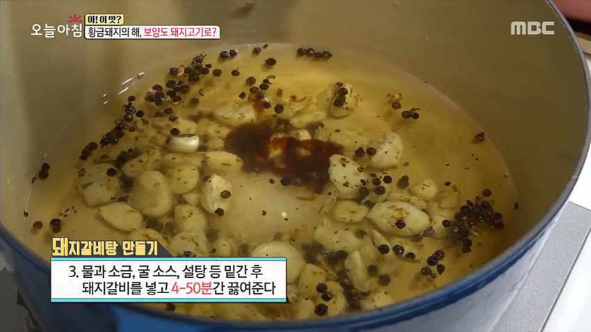 3. 물과 소금, 굴 소스, 설탕 등 밑간을 한 후 돼지갈비를 넣고 40~50분간 끓여주면 완성.