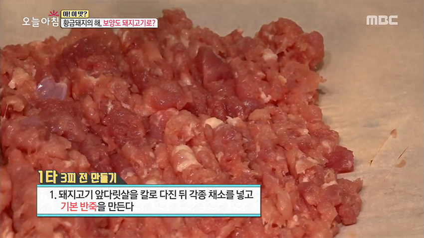1. 돼지고기 앞다리살을 칼로 다진 뒤 각종 채소를 넣고 기본 반죽을 만든다.
