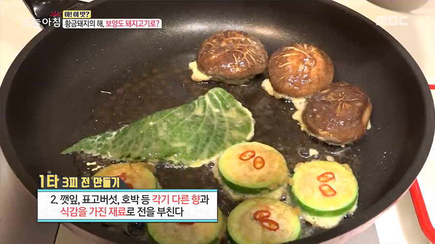2. 깻잎, 표고버섯, 호박 등 각기 다른 향과 식감을 가진 재료로 전을 부친다.