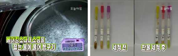 또한 끓는 물에 베이킹 소다나 소금을 풀어 헹궈주면 효과가 뛰어나다.