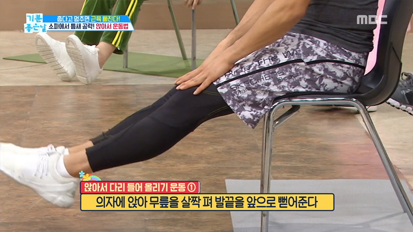 1. 의자에 허리를 기대지 않고 의자에 앉아 무릎을 살짝 펴 발끝을 앞으로 뻗어준다.