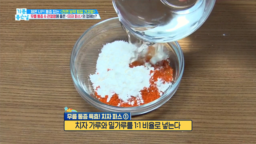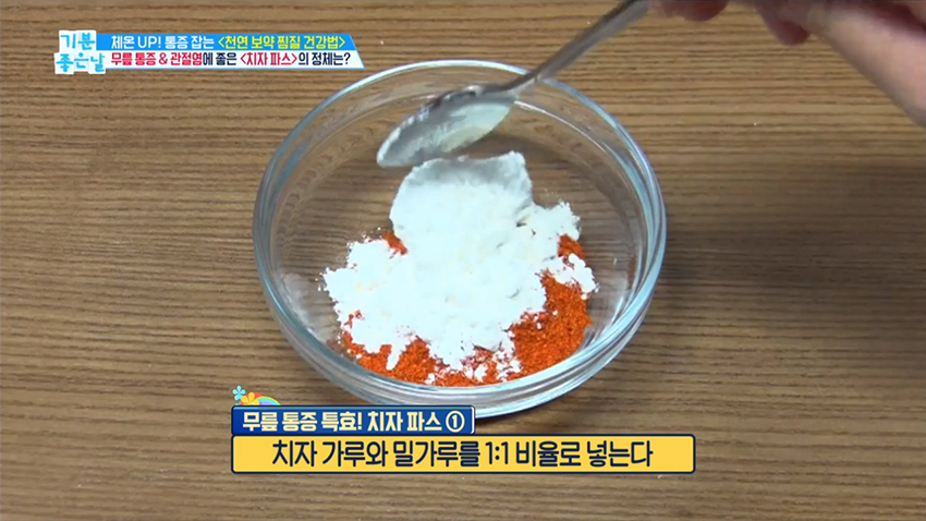 1. 치자 가루와 밀가루를 1:1 비율로 넣는다.