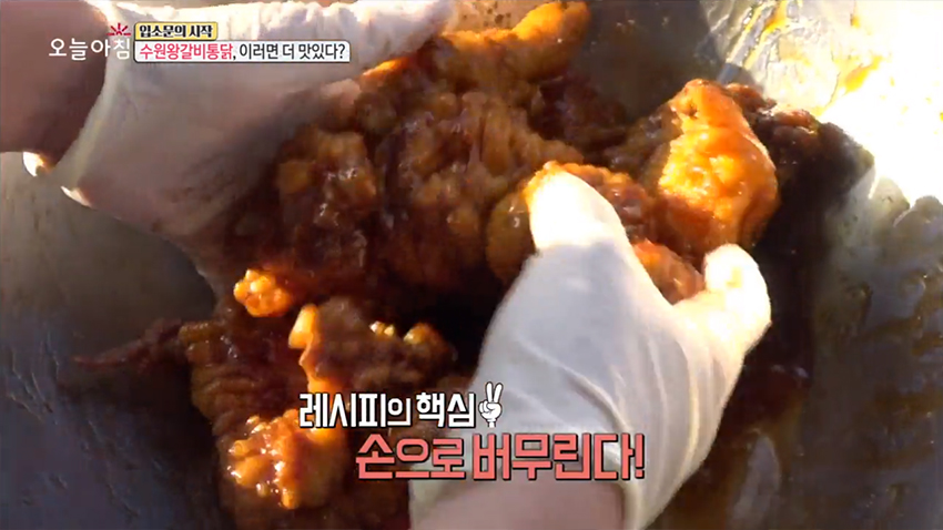 3. 직접 손을 사용, 열 번 이상 뒤집어 주면 수원 왕갈비 통닭 완성!