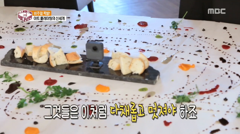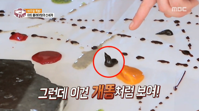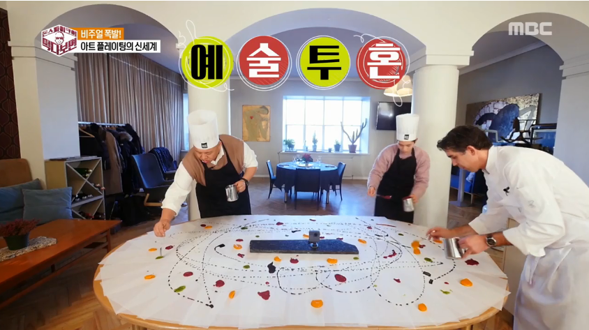 셰프는 거침없이 새하얀 테이블 위에 소스를 그리며 “잭슨 폴록처럼 해봐라”라고 말했고, 이들은 색색가지 소스로 테이블 위에 그림을 그렸다. 이 과정에서 동준이 점처럼 찍은 소스를 가리키며 셰프는 “개똥 모양이다”라고 지적해 폭소를 자아냈다. 이어서 그는 “직각으로 세워서 예쁜 모양으로 찍어야 한다”고 조언했다.