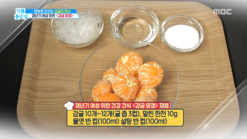 * 재료: 감귤 10~12개(귤 즙 3컵), 말린 한천 10g, 물엿 반 컵(100ml), 설탕 반 컵(100ml)
