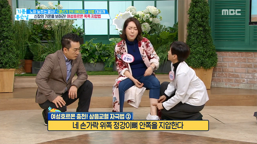 2. 네 손가락 위쪽 정강이뼈 안쪽을 지압한다.(세 개의 음경락이 교차하는 혈자리)