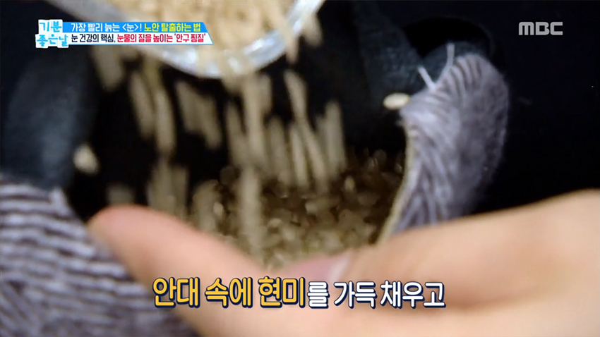 3. 속이 비어있는 안대나 수면 양말을 속에 팥, 귀리, 메밀 등 입자가 작은 곡류들로 넣고 입구를 꿰매 전자레인지에 30초 돌려 안구 찜질 안대를 만든다.