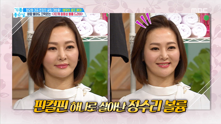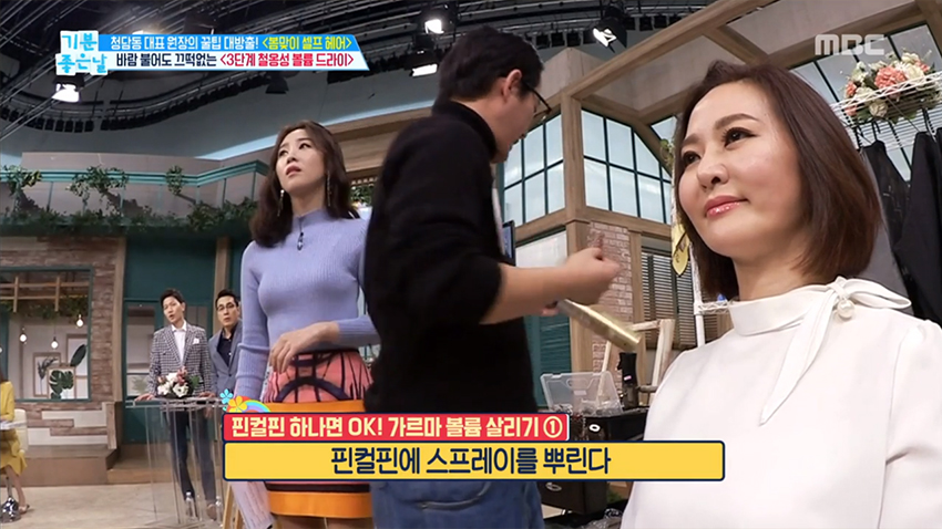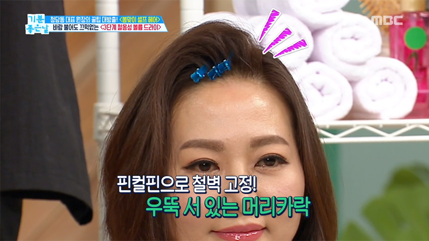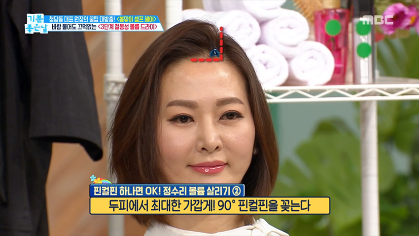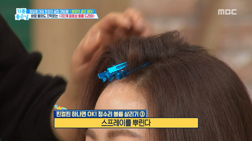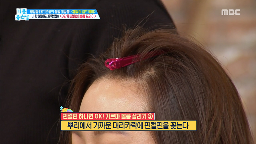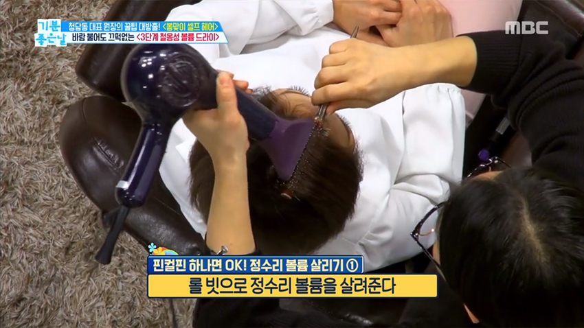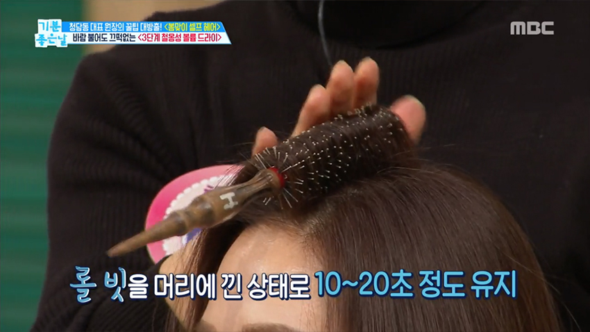 1. 롤 빗으로 정수리 볼륨을 살려준다.(정수리에 가까이 바람을 쐬어주고 롤 빗을 머리에 낀 상태로 10~20초 정도 유지시킨다)