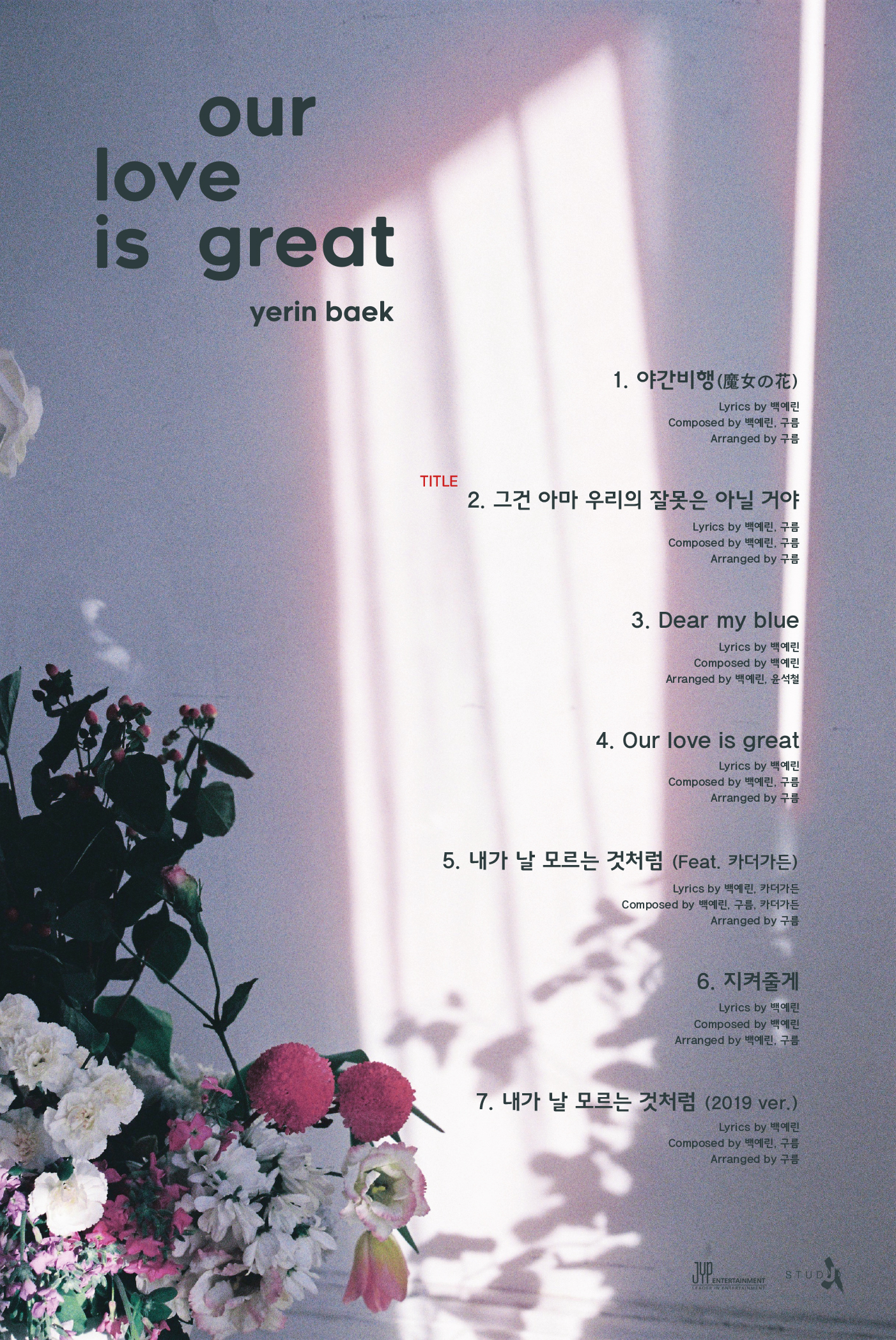 백예린은 3월 18일 새 디지털 미니앨범 'Our love is great'를 발표하고 컴백하는 가운데 12일 0시 JYP엔터테인먼트(이하 JYP) SNS를 통해 새 앨범 트랙리스트가 공개됐다.
