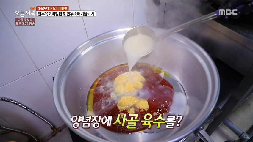 4. 사골 육수를 더해 깊은 맛을 낸 육회 양념장으로 전물 명물 '한우 육회 비빔밥'을 완성한다.