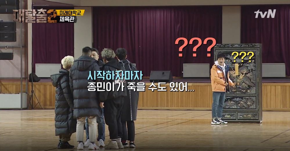 먼저 김종민이 체육관의 수상한 자개장 문을 열자 공이 쏟아져 나왔다. 이에 피오가 공으로 천장에 있는 과녁을 맞히는 능력을 발휘했다. 그의 성공으로 제작진이 준비한 ‘대탈출2’를 응원하는 플래카드가 펼쳐지면서 본격적인 추리가 시작됐다.