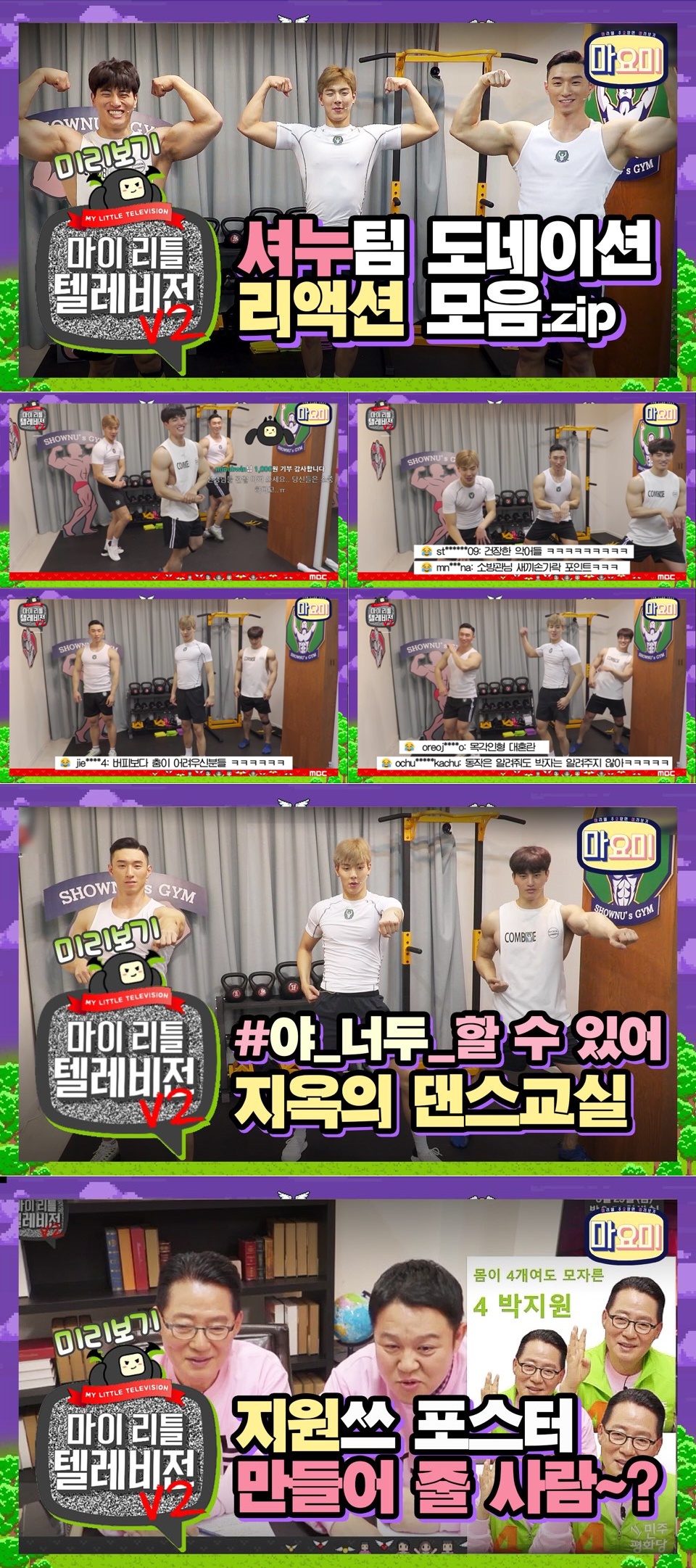 무엇보다 부끄러움이 많은 두 명의 근육맨을 위해 셔누는 몬스타엑스의 ‘앨리게이터’ 포인트 안무동작을 최종으로 도네이션 리액션으로 지정했다. 이후 세 사람은 손끝이 살아있는 앨리게이터 동작으로 반전 귀요미 매력을 폭발해 네티즌의 폭발적인 반응을 이끌어내기도.