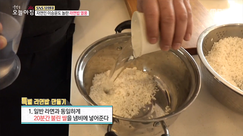 1. 일반 라면과 동일하게 20분간 불린 쌀을 냄비에 넣어준다.