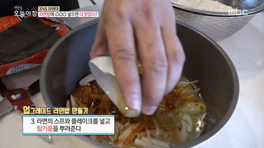 3. 라면의 수프와 플레이크를 넣고 참기름을 뿌려준다.