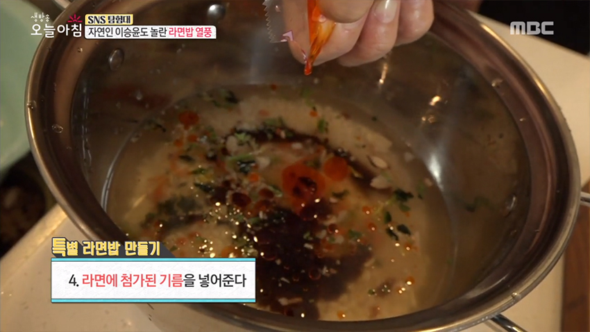 4. 라면에 첨가된 기름을 넣어준다.(가름에 튀긴 면과 기름에 튀기지 않은 쌀이 어우러질 수 있게 윤활제 역할을 해줌)