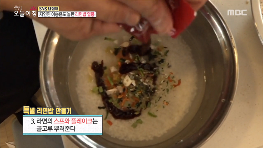 3. 라면의 수프와 플레이크는 골고루 뿌려준다.