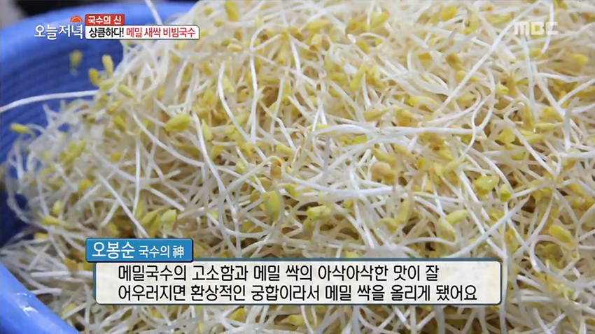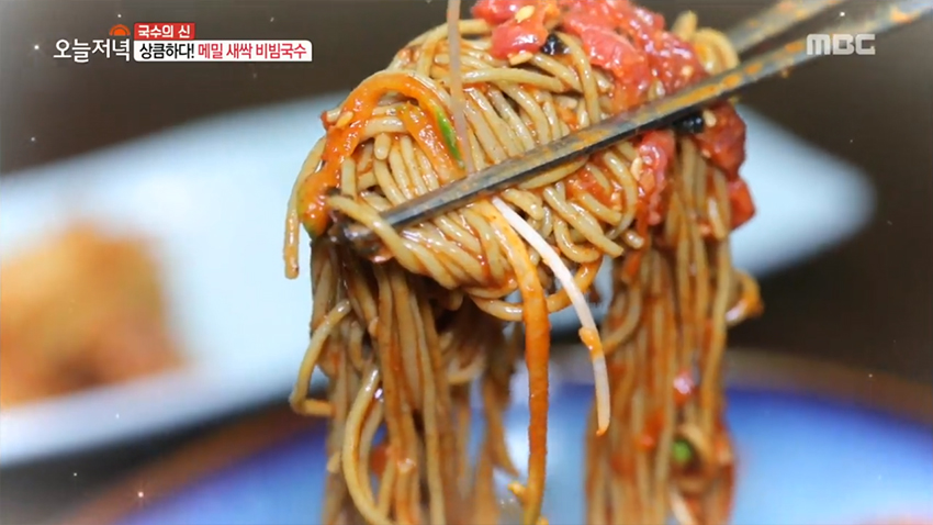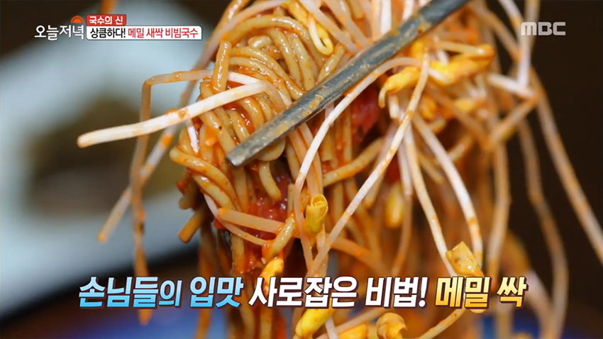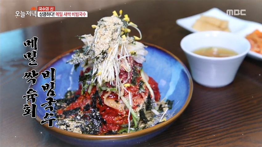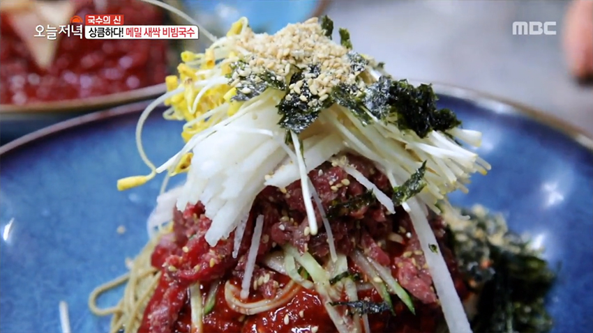 상큼하고 아삭한 식감 좋은 '메밀 새싹 육회 비빔국수'가 2019년 3월 27일 생방송 오늘 저녁에 소개되었다.