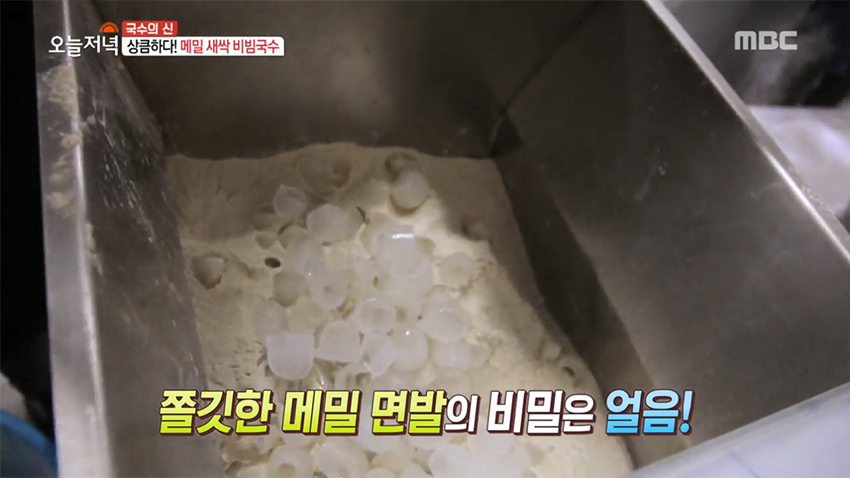 4. 면발의 쫄깃함을 더하기 위해 반죽 시 물 대신 기계에 얼음을 넣고 함께 반죽을 만든다.